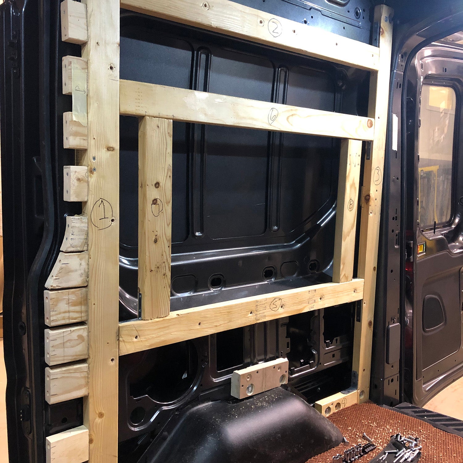 GB: Well, due to COVID-19 I've spent a lot more time at home than I'm typically used to. With my wide-open schedule, I logged way too many hours in the back of a dark van with a tape measure trying to think of every possible layout and the issues that would come with it. Once I had a rough idea of what I was looking for, I rolled in my dirtbike and took some additional measurements. Next came the duct tape and cardboard to create a rough mockup. That helped get an idea of what I was working towards, but did nothing to prepare me for how tricky things would get once wood and screws got involved. I thought the planning process was difficult, but that was only until I started to execute the build.