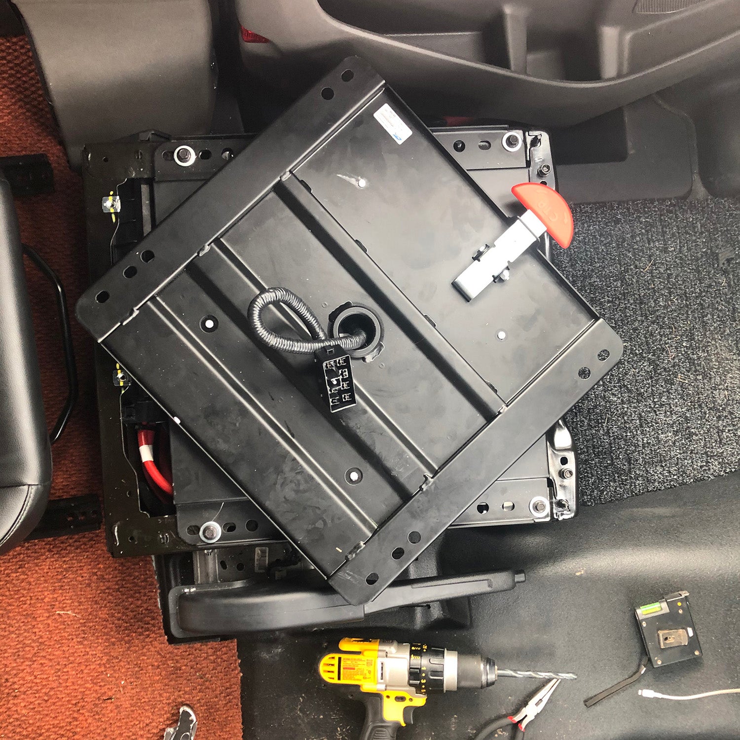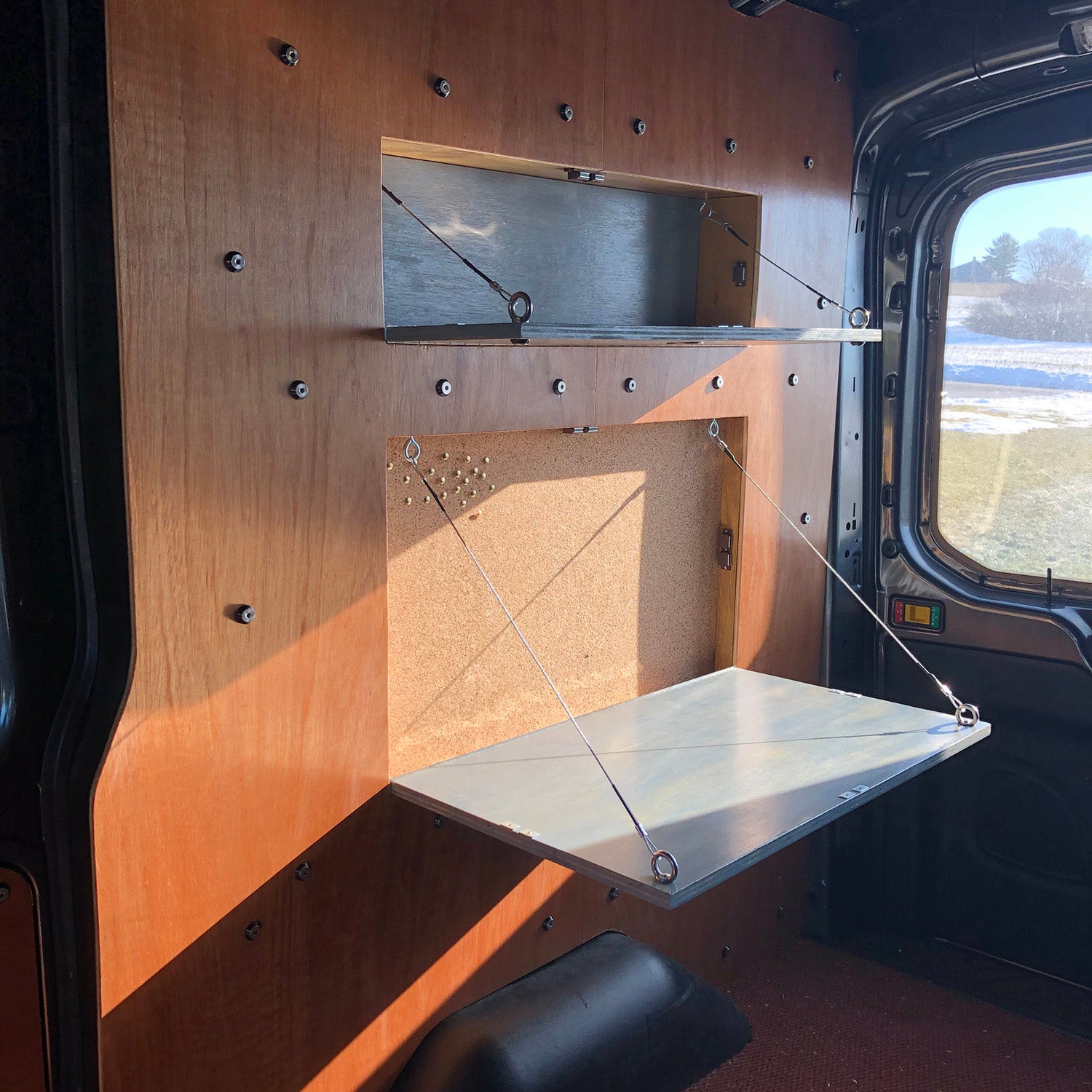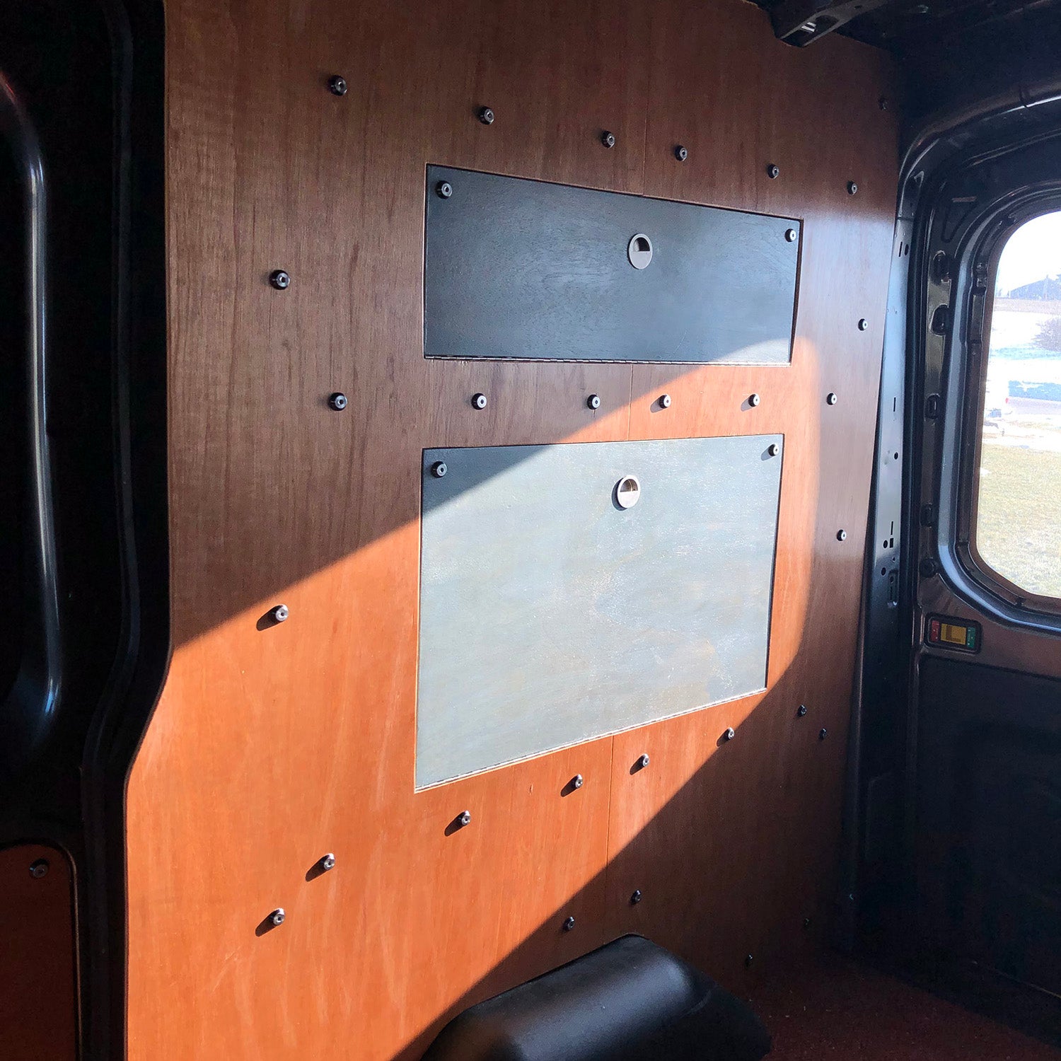 GB: Nearly every van forum, Facebook page, or YouTube video lists some "Must Have" tool that promises to make the entire project easier. After spending a lot of time online, I noticed that rivnut tools were commonly called out. For those that are unfamiliar, a rivnut is an internally threaded metal sleeve with a collar that fits into a predrilled hole. Rivnut tools have a threaded tip that mates with a rivnut once inserted into the hole. Two large handles press down to mushroom out the back of the rivnut to hold it in place. Unsure of their strength, I threaded in an M8 eyebolt and looped a bit of climbing rope through. I was very impressed with the strength of the hold and ended up using a ton of them inside the van.