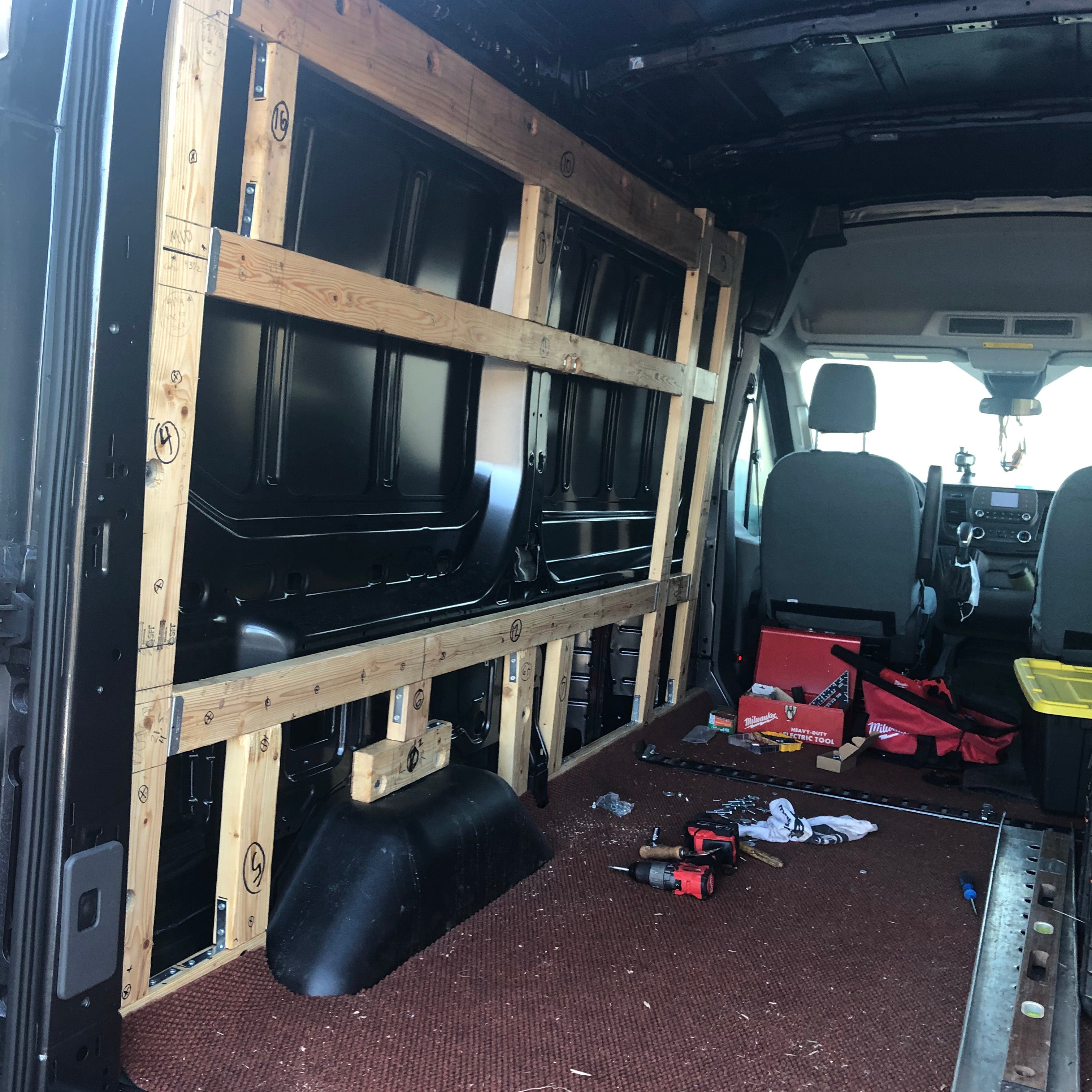 GB: Well, due to COVID-19 I've spent a lot more time at home than I'm typically used to. With my wide-open schedule, I logged way too many hours in the back of a dark van with a tape measure trying to think of every possible layout and the issues that would come with it. Once I had a rough idea of what I was looking for, I rolled in my dirtbike and took some additional measurements. Next came the duct tape and cardboard to create a rough mockup. That helped get an idea of what I was working towards, but did nothing to prepare me for how tricky things would get once wood and screws got involved. I thought the planning process was difficult, but that was only until I started to execute the build.
