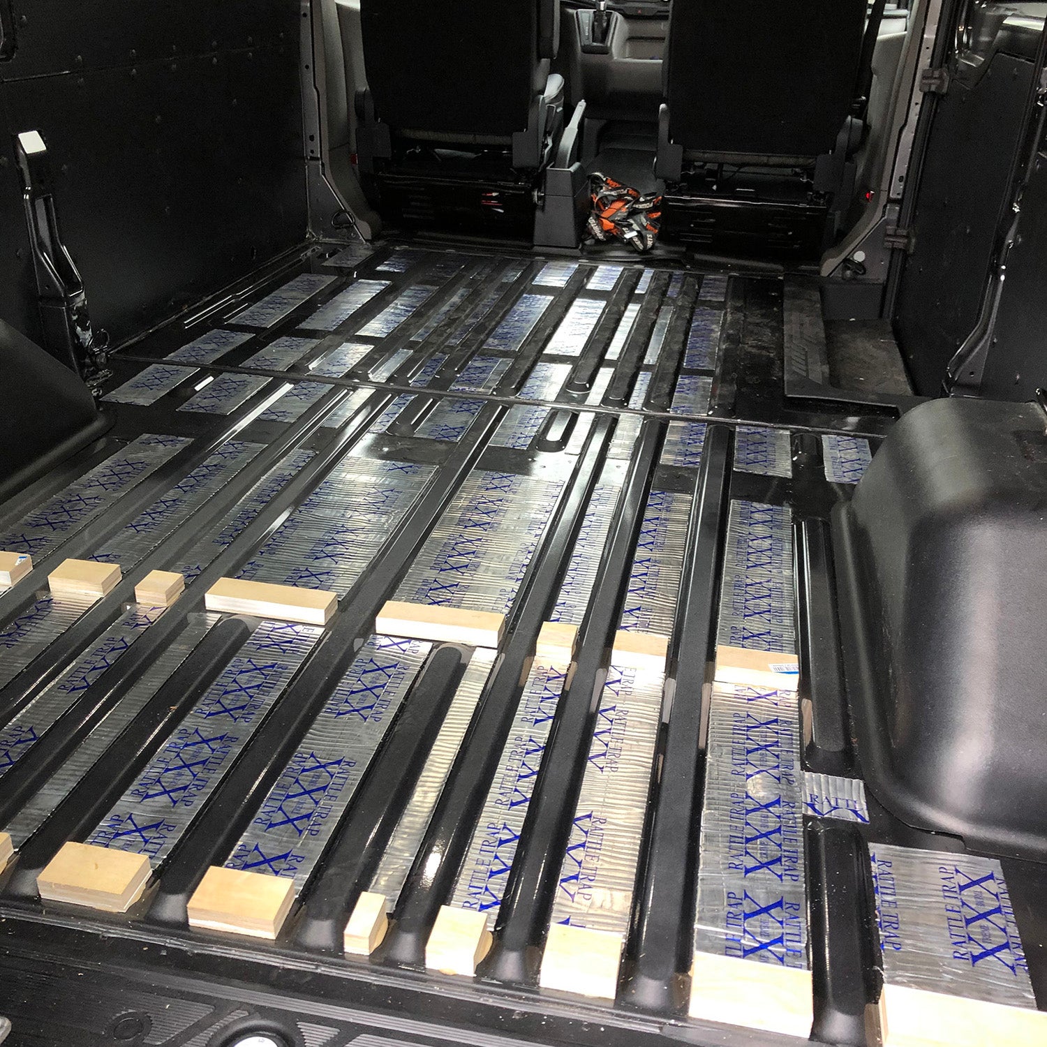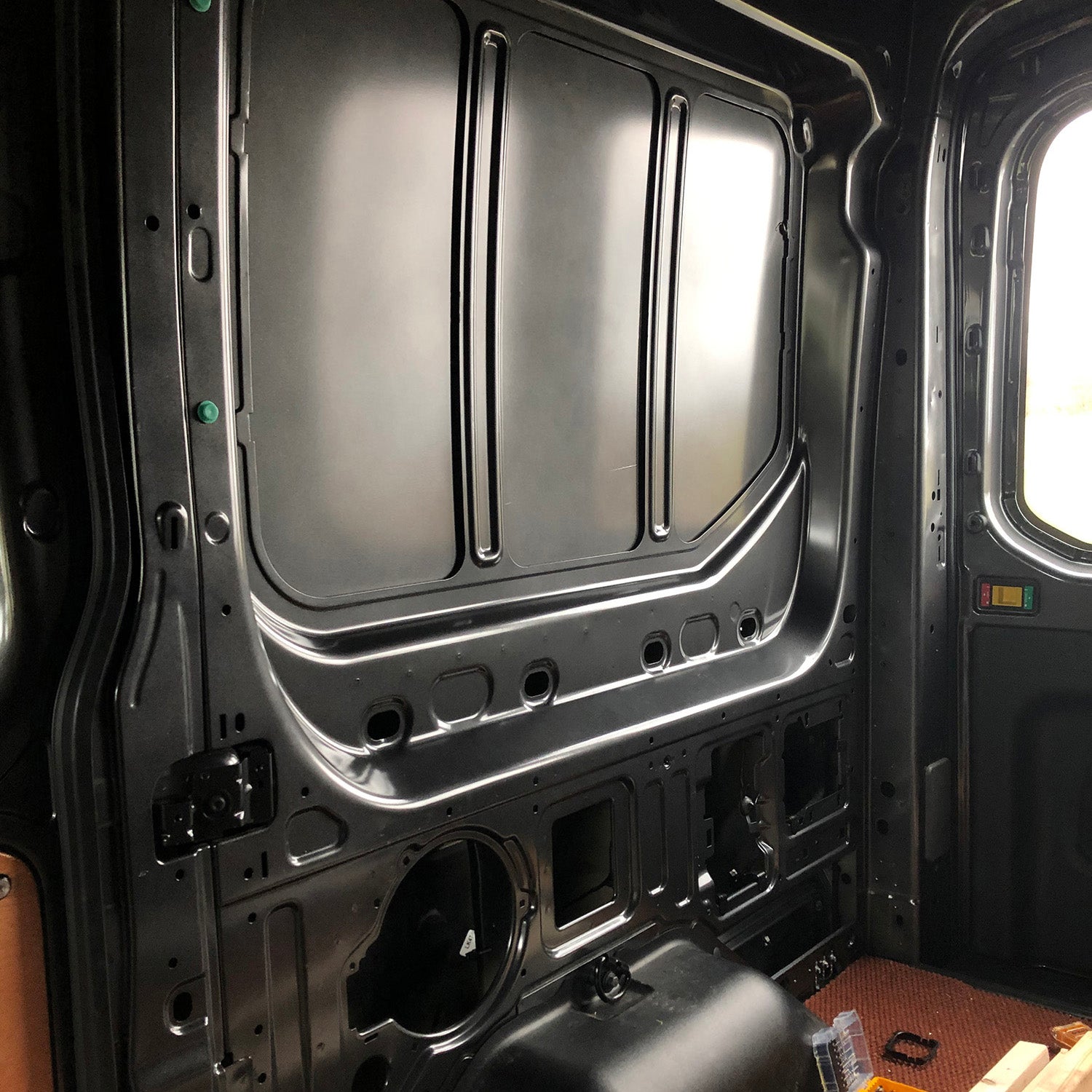 GB: Nearly every van forum, Facebook page, or YouTube video lists some "Must Have" tool that promises to make the entire project easier. After spending a lot of time online, I noticed that rivnut tools were commonly called out. For those that are unfamiliar, a rivnut is an internally threaded metal sleeve with a collar that fits into a predrilled hole. Rivnut tools have a threaded tip that mates with a rivnut once inserted into the hole. Two large handles press down to mushroom out the back of the rivnut to hold it in place. Unsure of their strength, I threaded in an M8 eyebolt and looped a bit of climbing rope through. I was very impressed with the strength of the hold and ended up using a ton of them inside the van.