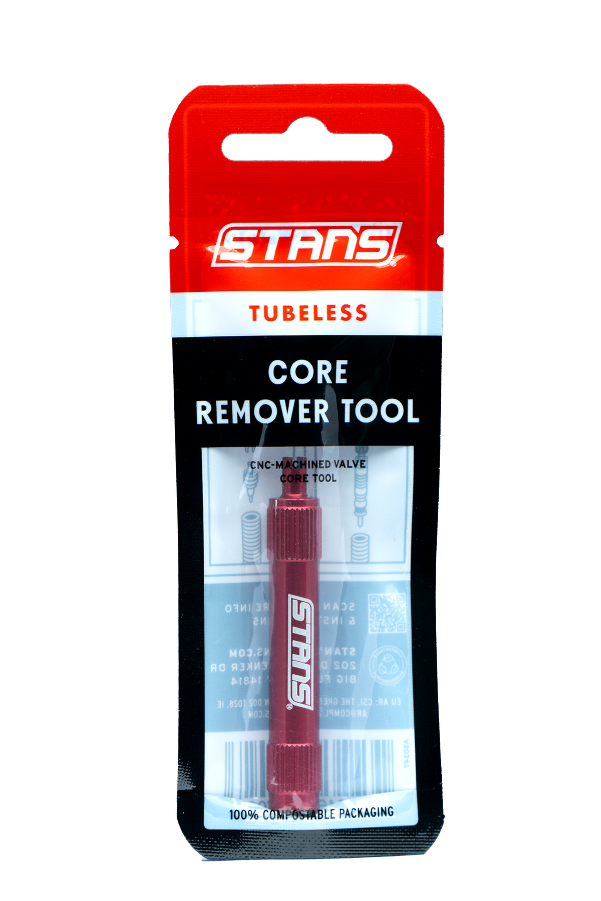Removes Presta and Schrader valve cores. CNC machined, anodized finish with laser etched logo. Fits between spokes for quick and easy core removal. Features knurled end for a no-slip grip.